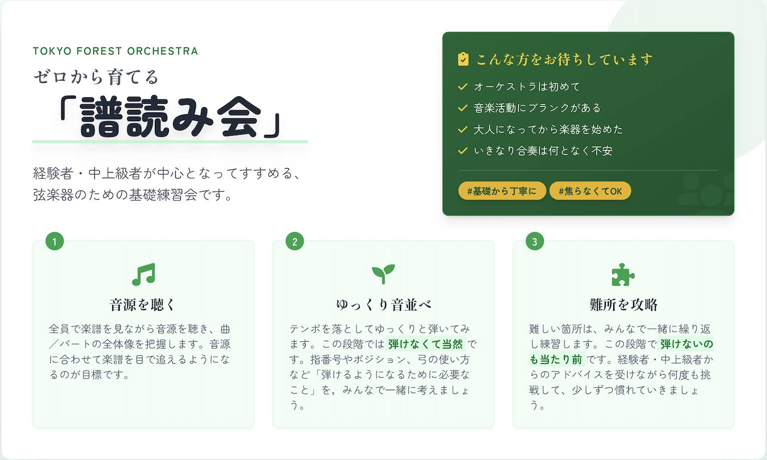 東京フォレストオーケストラでは、複数の練習スタイルを組み合わせて音楽づくりを行っています。それぞれの練習に役割があり、全体として一歩ずつ前進していく仕組みになっています。
